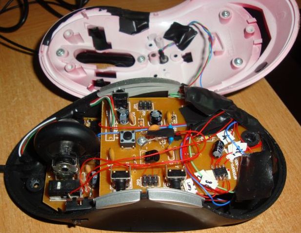 O circuito original onde tem o botão esquerdo foi interrompido. O novo circuito, que é controlado por um microcontrolador, recebe os sinais do botão e envia de novo os sinais alterados, ou não, para a placa original do rato.